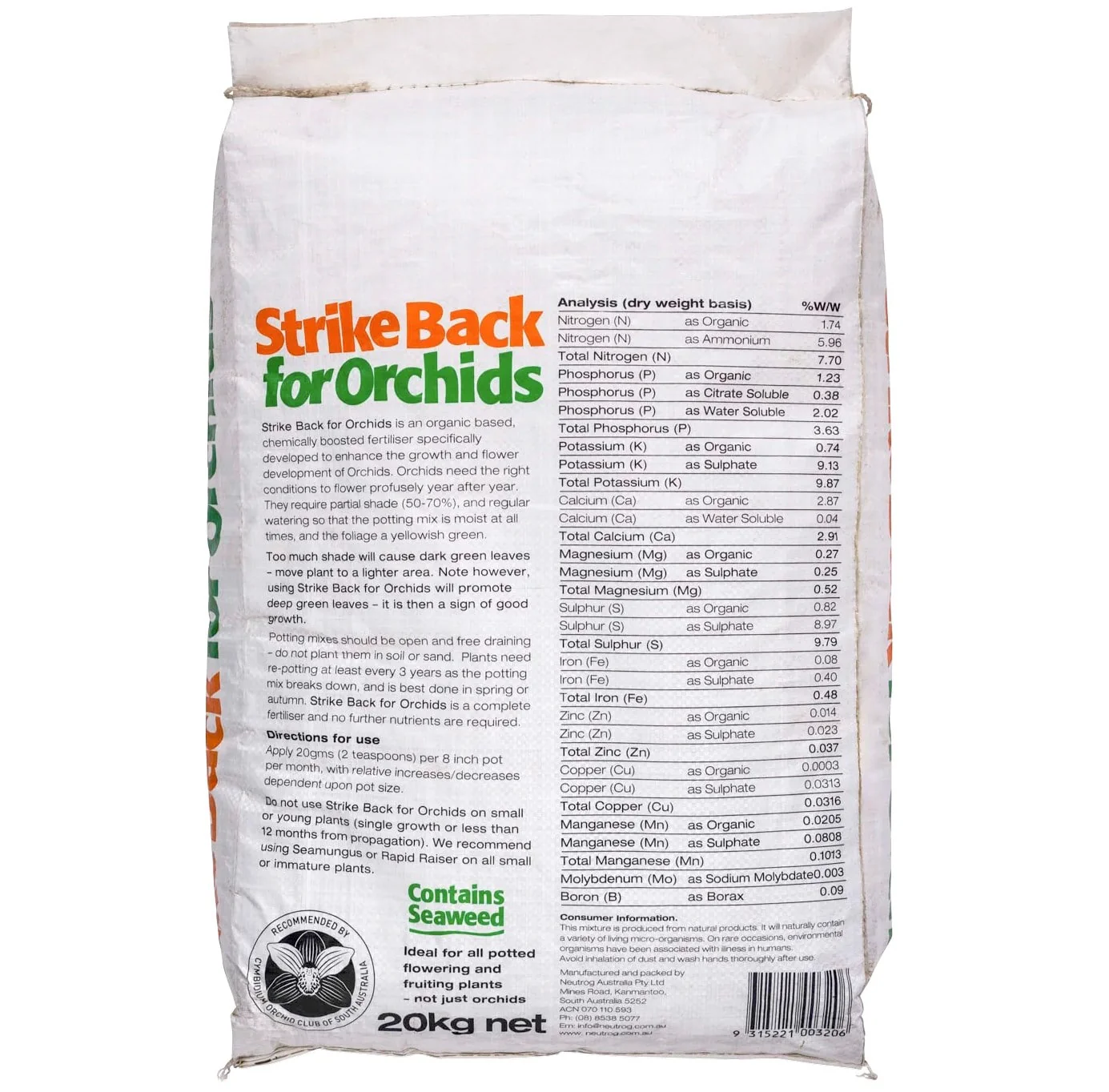 Neutrog commenced development of Strike Back for Orchids in early 2006 through establishing trials with various commercial orchid growers and via the members of a number of orchid clubs throughout Australia. Success in these trials has resulted in Strike Back for Orchids being recommended and endorsed by the Cymbidium Orchid Clubs of SA, NSW, WA and Victoria.