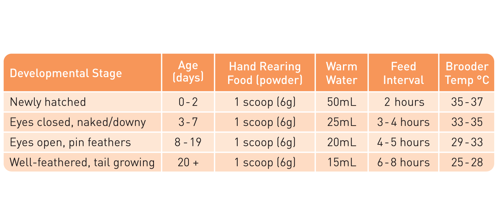 Prepare Hand Rearing Food by mixing powder with pre-boiled, warm water (approx. 50˚C) according to the chart below. Allow mixture to stand for one minute to absorb all the water. Remix, and feed at a temperature of 38-40˚C with a spoon, syringe or crop tube. Prepare food fresh each meal and thoroughly clean utensils between feeds.